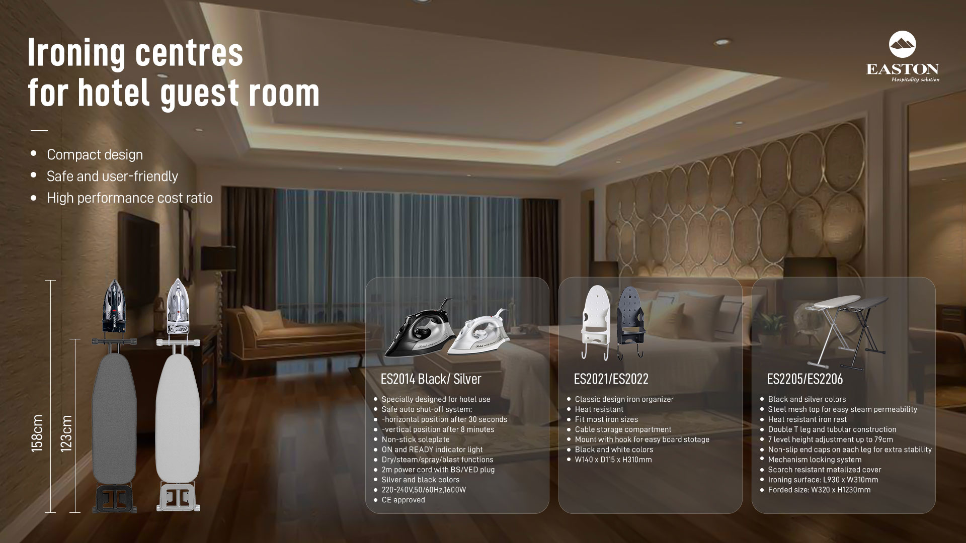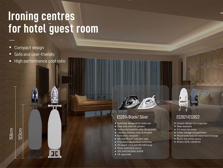 Centro de planchado del hotel ES2209. Es cubierta de placa plateada con marco negro mate tres elementos para ser un conjunto completo, con un sistema de seguridad 1 x ES2209 tablero de planchar, ajuste de altura de 7 niveles de hasta 87 cm, fieltro acolchado de 10 mm, cubierta metalizada resistente a Scorch 1 x ES2014 Iron de vapor, función de cierre de vapor seguro, posición horizontal después de 30 segundos, posición vertical después de 8 mins, no sespla de vapor de vapor. 1 x ES2023 Soporte de hierro inteligente, resistente a la alta temperatura, 180 grados de rotación, bueno para el usuario plegado de usuario de la mano derecha y izquierda con soporte de hierro: W360 x D235 x H1320 mm
